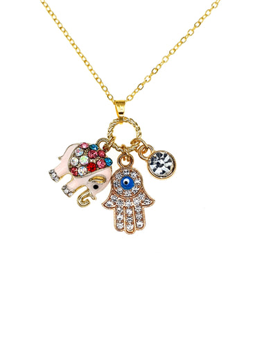 Elephant Hamsa Multi Charm Good Luck Gold Necklace